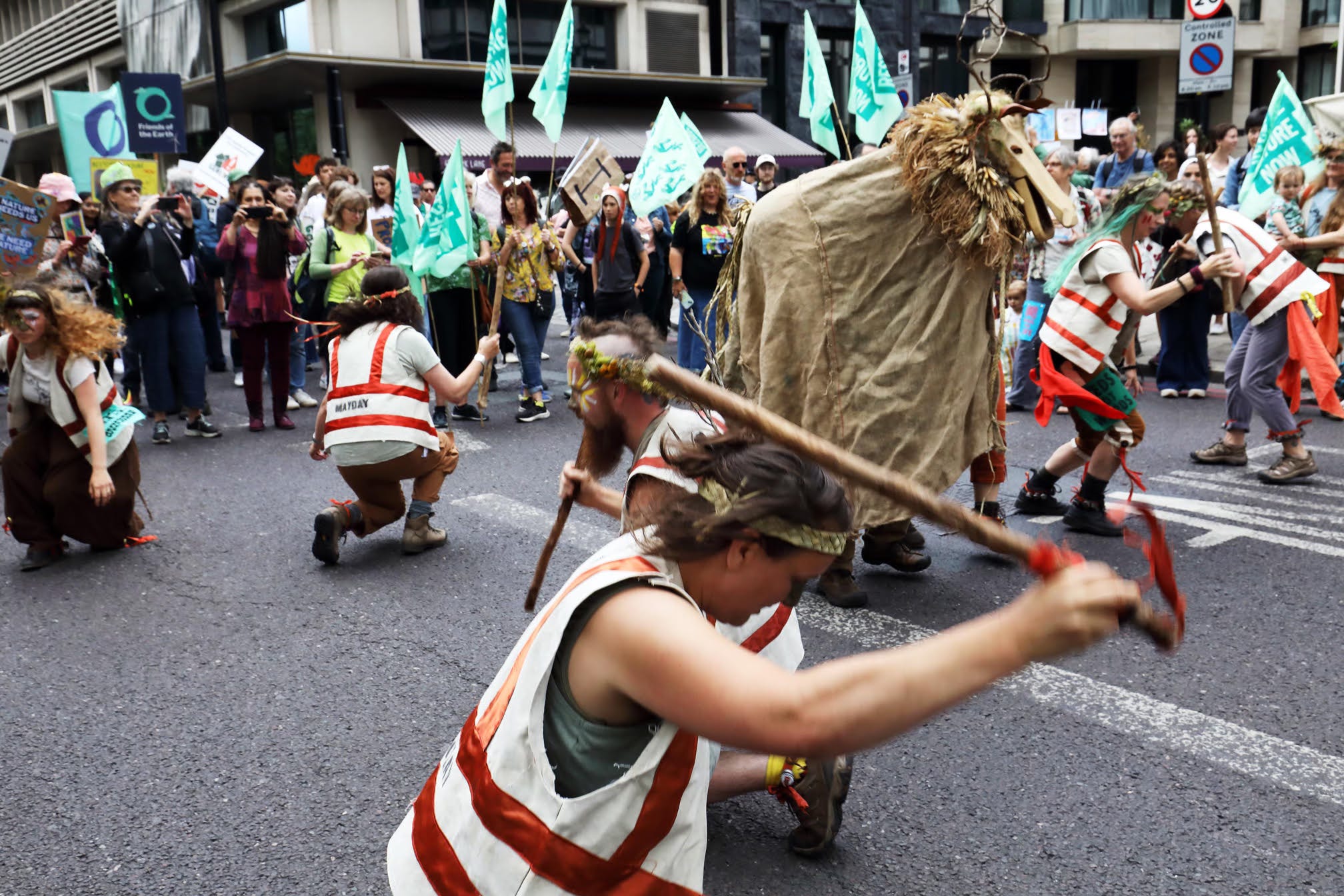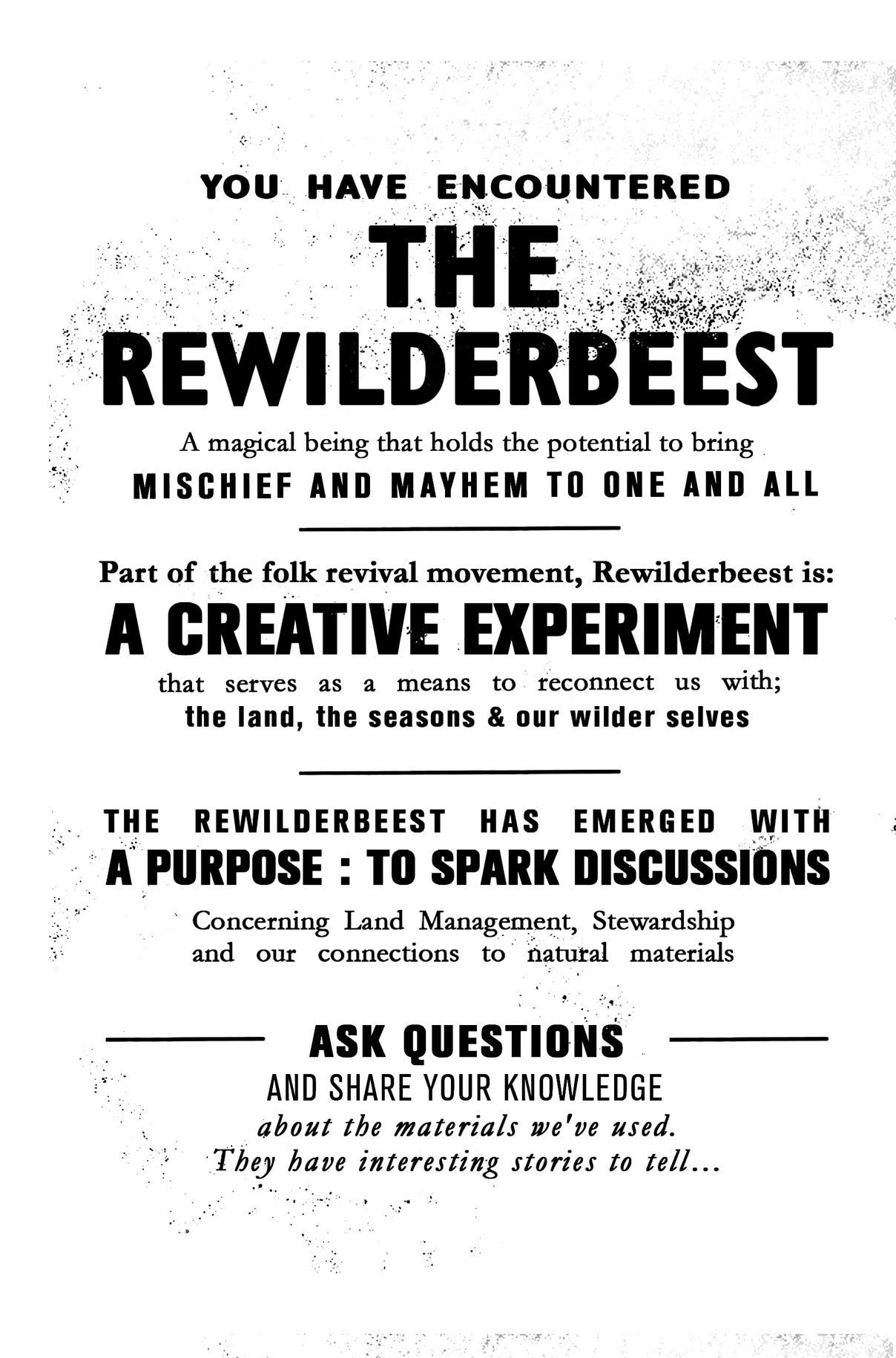 The Rewilderbeest is the last of its kind—a mythical creature born from the rift between ecological collapse and our deep-rooted longing for reconnection with the land. Part folk hero, part ecological spirit, the Rewilderbeest roams moorlands, meadows, cities and woodlands in search of restoration and belonging. A gentle grazer and moss enthusiast, the Rewilderbeest invites us to question, to share knowledge, and spark conversations about land stewardship and our connections to natural materials.